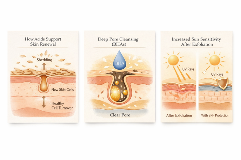 Acids support the skin’s natural renewal process by encouraging cell turnover.